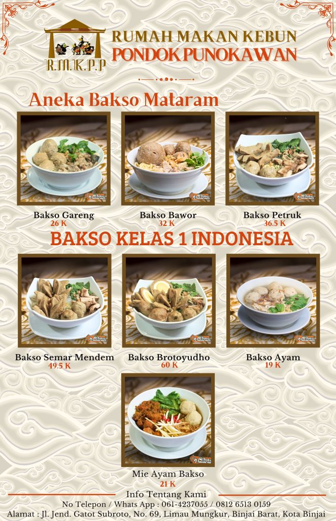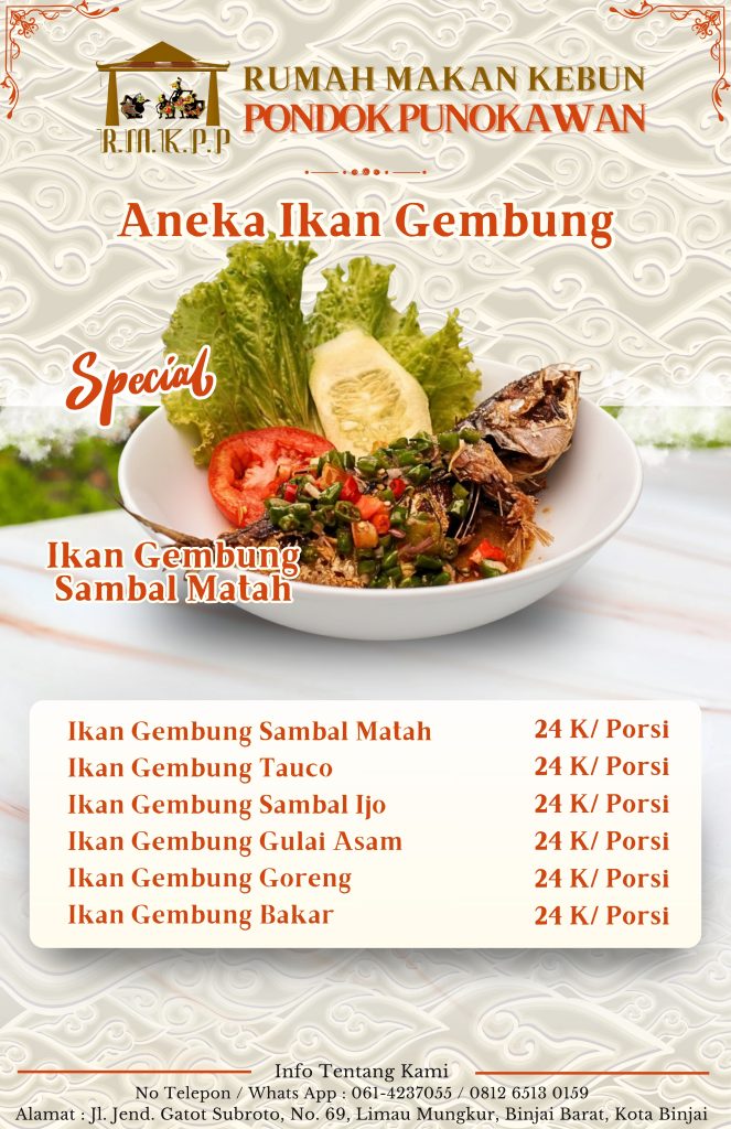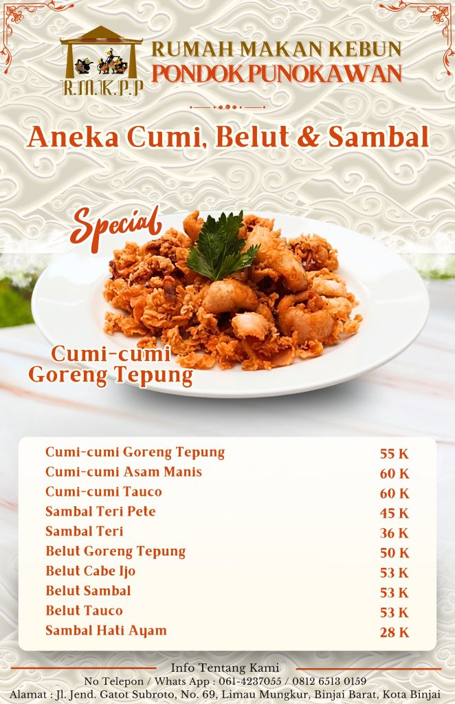 Menu Lokal Pondok Punokawan Divisi IT Juli 26, 2024 Lainnya, Menu PrevSebelumnyaTourist Menu RM. Kebun Pondok Punokawan SelanjutnyaAlat Musik : GamelanNext Mungkin Anda Akan Menyukai BONI KAMBOJA LIMAU BALI DAFTAR MENU RUMAH SOP SEGER MANTEB Menu Lokal Pondok Punokawan Pendopo Giri Moyo RM. Kebun Pondok Punokawan Lihat Lebih Banyak Tidak ada berita lainnya Tinggalkan Balasan Batalkan balasanAlamat email Anda tidak akan dipublikasikan. Ruas yang wajib ditandai *KomentarNama * Email * Situs Web Simpan nama, email, dan situs web saya pada peramban ini untuk komentar saya berikutnya. Lihat Ini Berita BeritaPRESIDEN JOKOWI MAKAN DI PUNOKAWAN BINJAI Berita (1) Data Flora & Fauna (48) Karir (1) Lainnya (16) Menu (1) Sosok (1) Karir KarirPRESIDEN JOKOWI MAKAN DI PUNOKAWAN BINJAI Menu Kami MenuMenu Lokal Pondok Punokawan